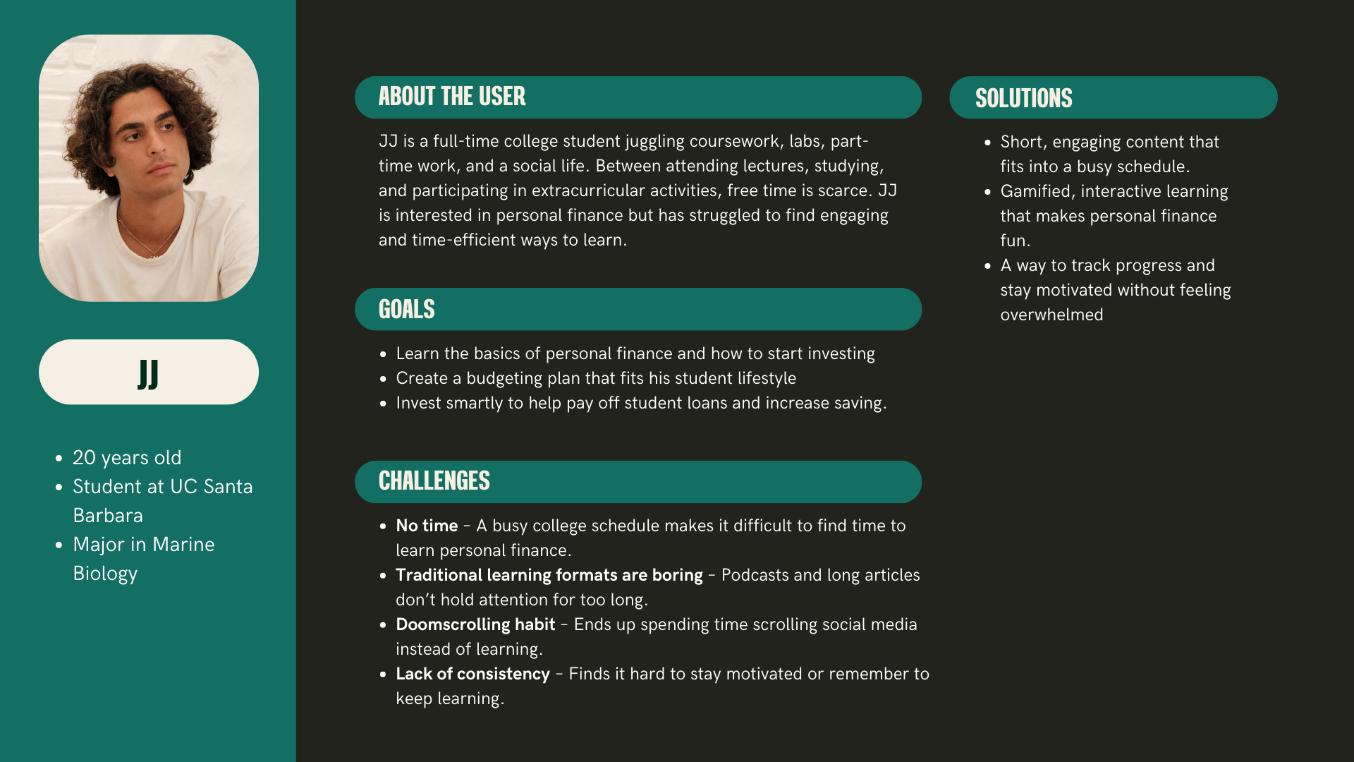 After identifying key user pain points — such as time constraints, difficulty staying consistent, and boring learning formats filled with complex jargon — I crafted these user personas to get a better understanding of potential users and how to approach fixing these pain points.