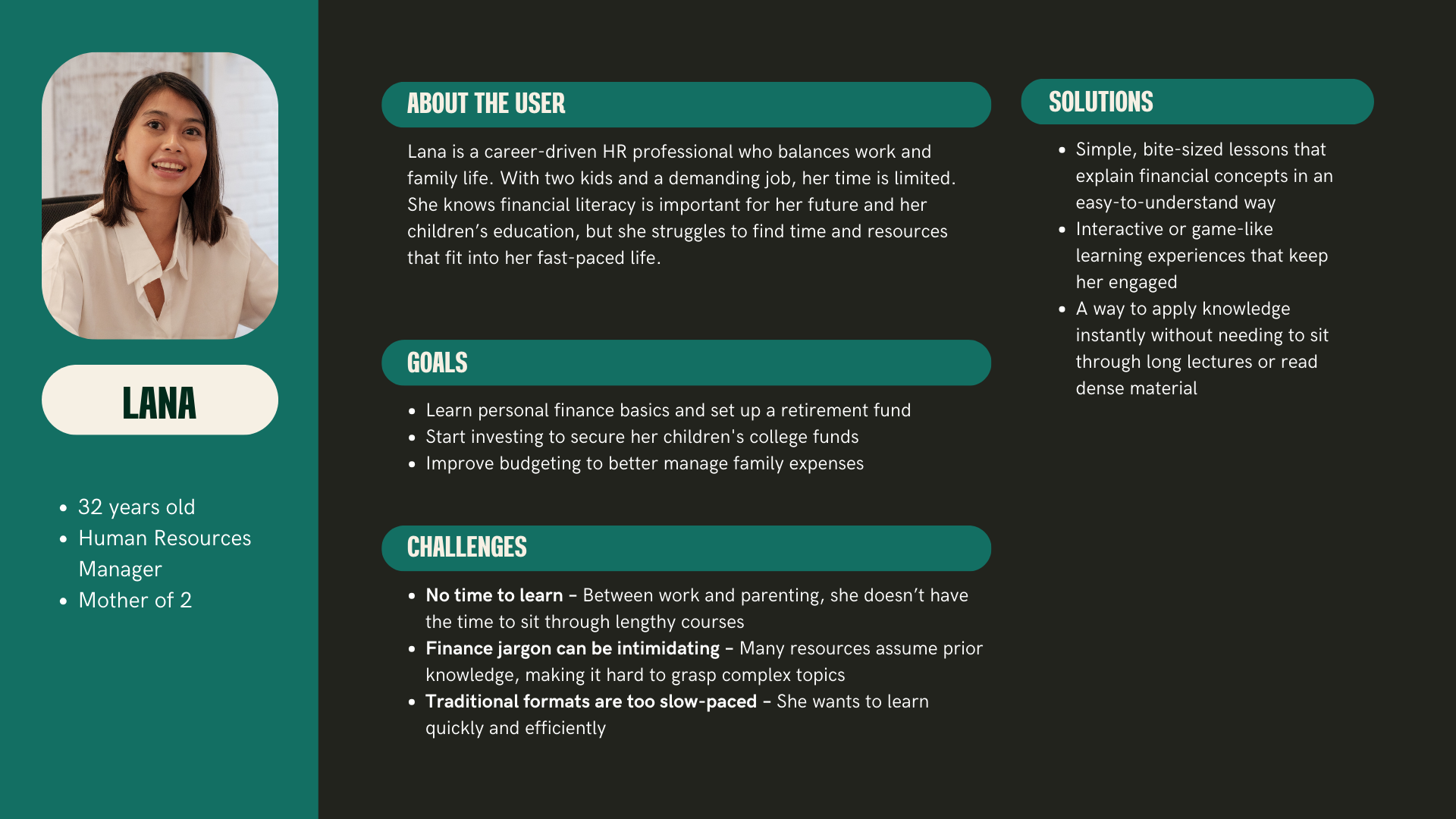 Traditional personal finance education is often lengthy, complex, and unengaging, making it difficult for people with limited time to stay consistent. How can we make learning about personal finance engaging, easy to understand, and adaptable to the time constraints of busy individuals?